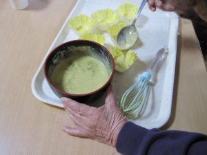 先日、今月の手作りおやつイベント第2弾「抹茶カップケーキ」を作りました。材料はセットのケーキ粉、牛乳、卵、抹茶粉、砂糖等。何方でも簡単に作れるのが魅力です(^0^)