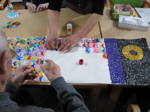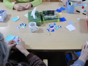 小さな折り紙で作ったかぶとをウロコニに見立て、色鮮やかにのり付けしている最中です。