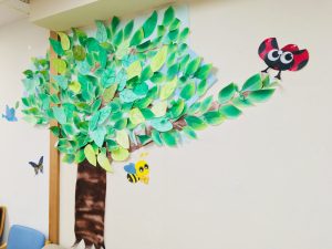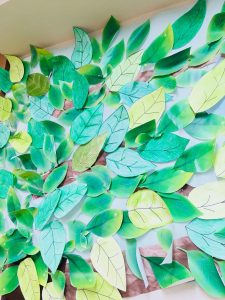 これらはデイの壁に飾った新緑をイメージした飾りです。これ、もとは桜が付いていたのですが、季節に合わせて姿を変化していきました。