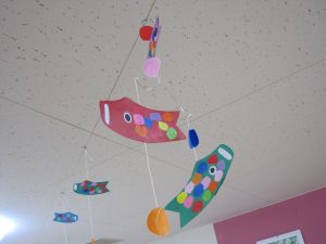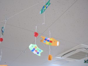 ディサービス中山では皆さまに鯉のぼりのモビールを作っていただき天井から泳がせてみました。