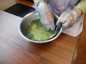スプーンの背を使ってひたすら潰す方法、手袋をはめた手で潰す方法と様々でした。