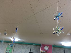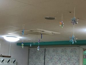 七夕も終わりフロアー内が、なんだか殺風景になってしまった為、今月半ばからお客さまに作っていただいた、花飾りを飾らせていただきました。