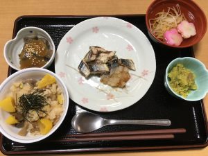 栗ご飯、秋刀魚(大根おろし添え)、お芋のサラダ、茄子田楽、にゅう麺です。