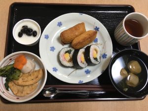 昼食は海苔巻き、お稲荷さん、いわし汁、デザートもつきました。