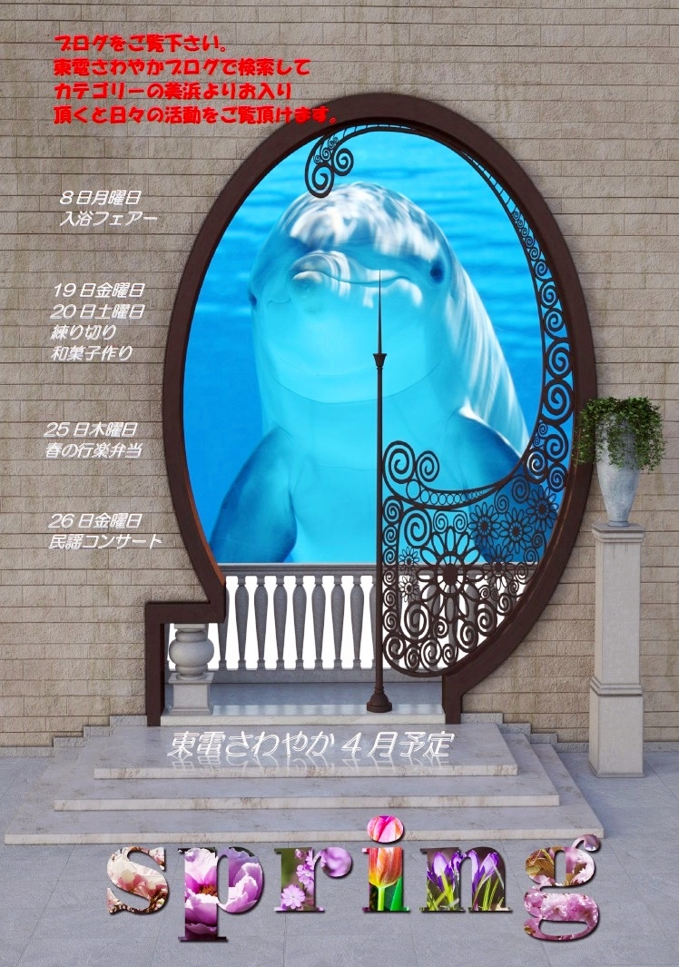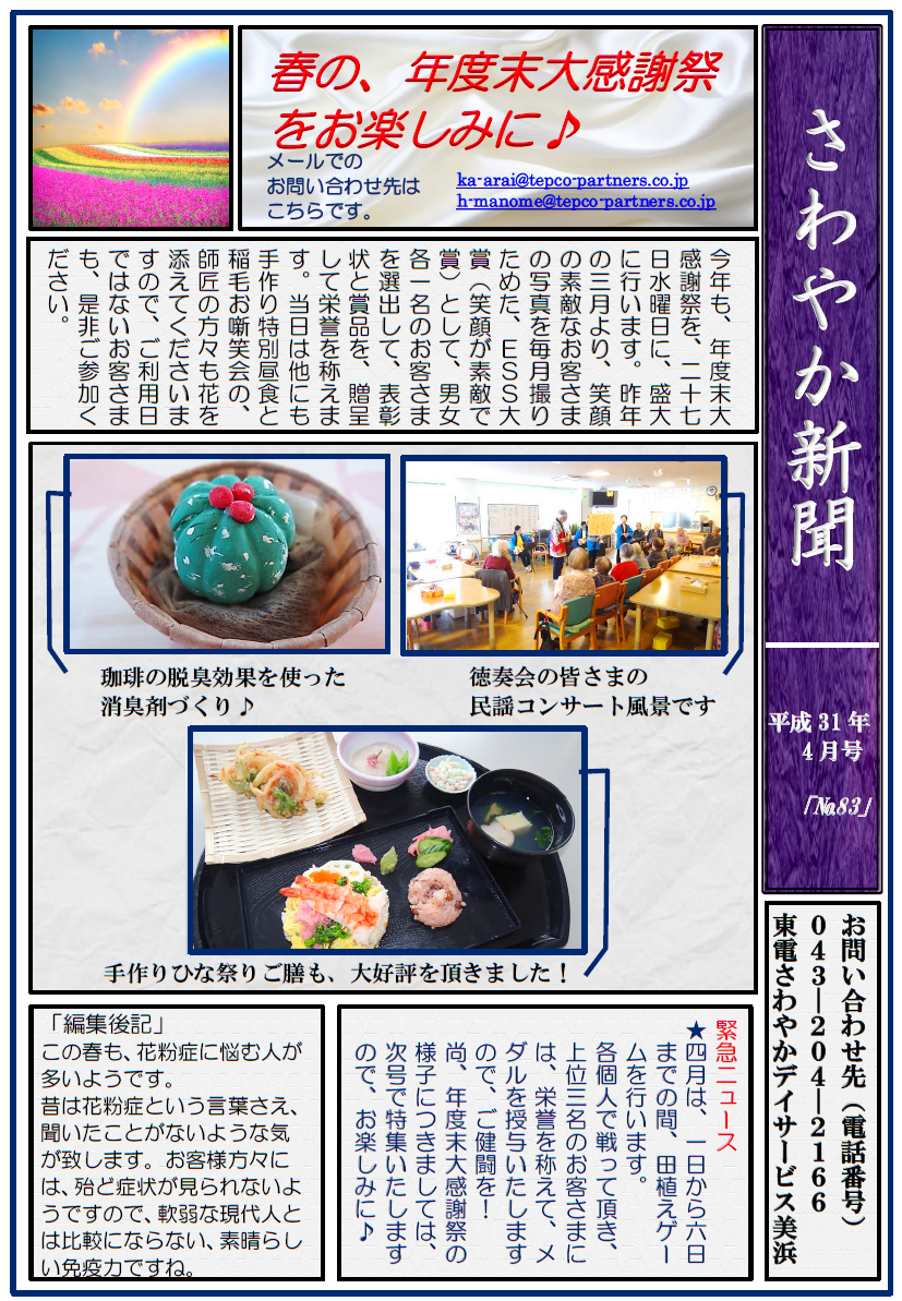 美浜 2019.03.27 さわやか新聞4月号<デイ美浜> こんにちは。 東電さわやかデイサービス美浜です。 4月の予定をお知らせ致します。 どうぞ、お楽しみに!! ~スタッフ募集中~ 私たちと一緒にお客さまを笑顔にするお手伝いをしてみませんか? TEL 03-5621-7337 (本社:採用担当) ホームページはここから 東電さわやかデイサービス美浜では、随時見学を受け付けています。 ご興味がある方は、是非043-204-2166までご連絡ください。 皆さまからのご連絡お待ちしております!