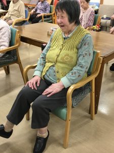 入浴が無い方は午前中座って過ごす事が多いので、足の血行が良くなる様に、脳トレプリントの答え合わせの前に軽い体操をしています。