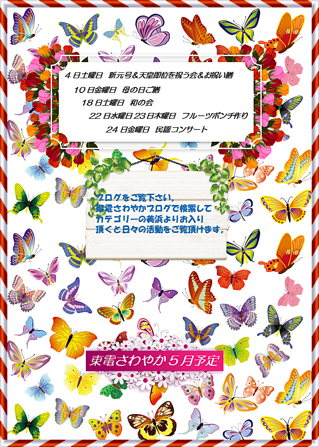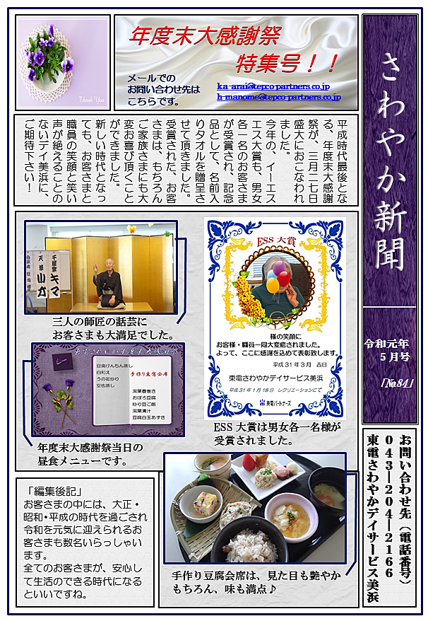 美浜 2019.04.22 さわやか新聞5月号<デイ美浜> こんにちは。 東電さわやかデイサービス美浜です。 令和元年、初となるさわやか新聞です。 令和時代も、デイ美浜で お楽しみください♥ ~スタッフ募集中~ 私たちと一緒にお客さまを笑顔にするお手伝いをしてみませんか? TEL 03-5621-7337 (本社:採用担当) ホームページはここから 東電さわやかデイサービス美浜では、随時見学を受け付けています。 ご興味がある方は、是非043-204-2166までご連絡ください。 皆さまからのご連絡お待ちしております!