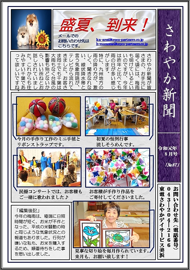 美浜 2019.07.26 さわやか新聞8月号<デイ美浜> こんにちは。 東電さわやかデイサービス美浜です。 もうすぐ、梅雨明けとの予報も♪ 8月も様々なイベントが目白押しです。 今年の夏も、東電さわやかで お楽しみください♥ ~スタッフ募集中~ 私たちと一緒にお客さまを笑顔にするお手伝いをしてみませんか? TEL 03-5621-7337 (本社:採用担当) ホームページはここから 東電さわやかデイサービス美浜では、随時見学を受け付けています。 ご興味がある方は、是非043-204-2166までご連絡ください。 皆さまからのご連絡お待ちしております!