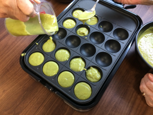 ホットケーキの生地に抹茶を混ぜた生地をたこ焼き器に流し込みます。