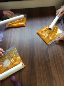 早速、軟らかくゆでた南瓜を潰します。袋の中に砂糖、バターも入っています。