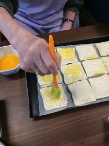 小さく切ったパイシートの上に南瓜のペーストを乗せ、その上にパイシートを重ねます。