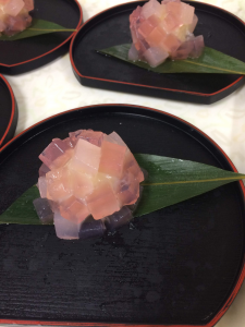 桃のペーストで作ったピンクの寒天をダイスにカットし、
