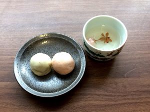 おやつの時間は紅白まんじゅうと桜茶を提供しました。