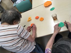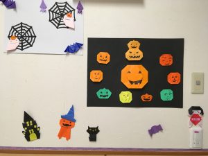 としま2 2020.09.25 🎃 今月の壁面飾りはハロウィンです。 年配の方にはあまり馴染みの無いイベントではありますが、職員が怖い顔を描いて下さいと依頼すると、皆さん思い思いにカボチャに顔を描いて下さいました。