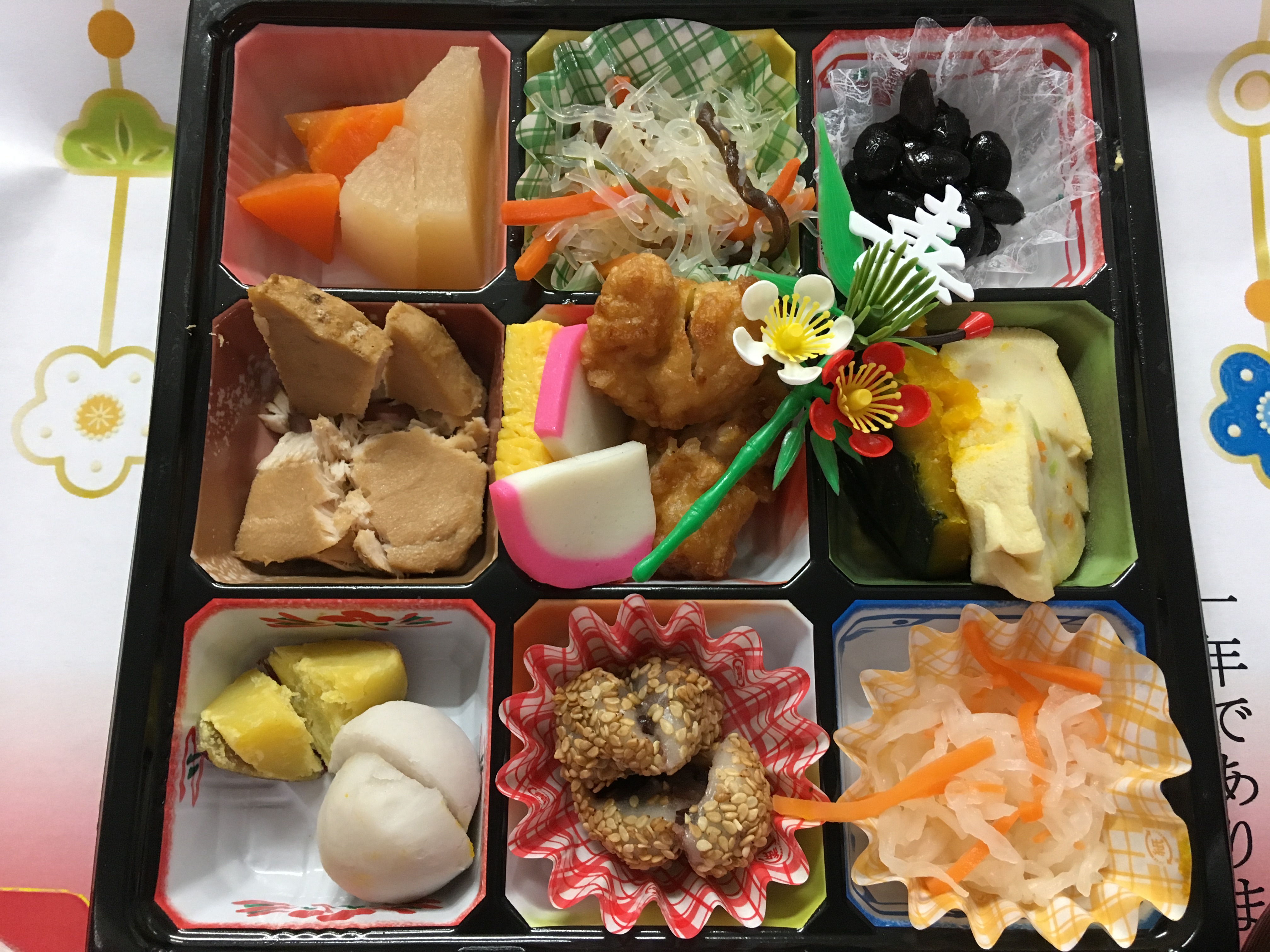 お節料理の黒豆やおなますが入り、種類も豊富でたっぷり豪華なお弁当