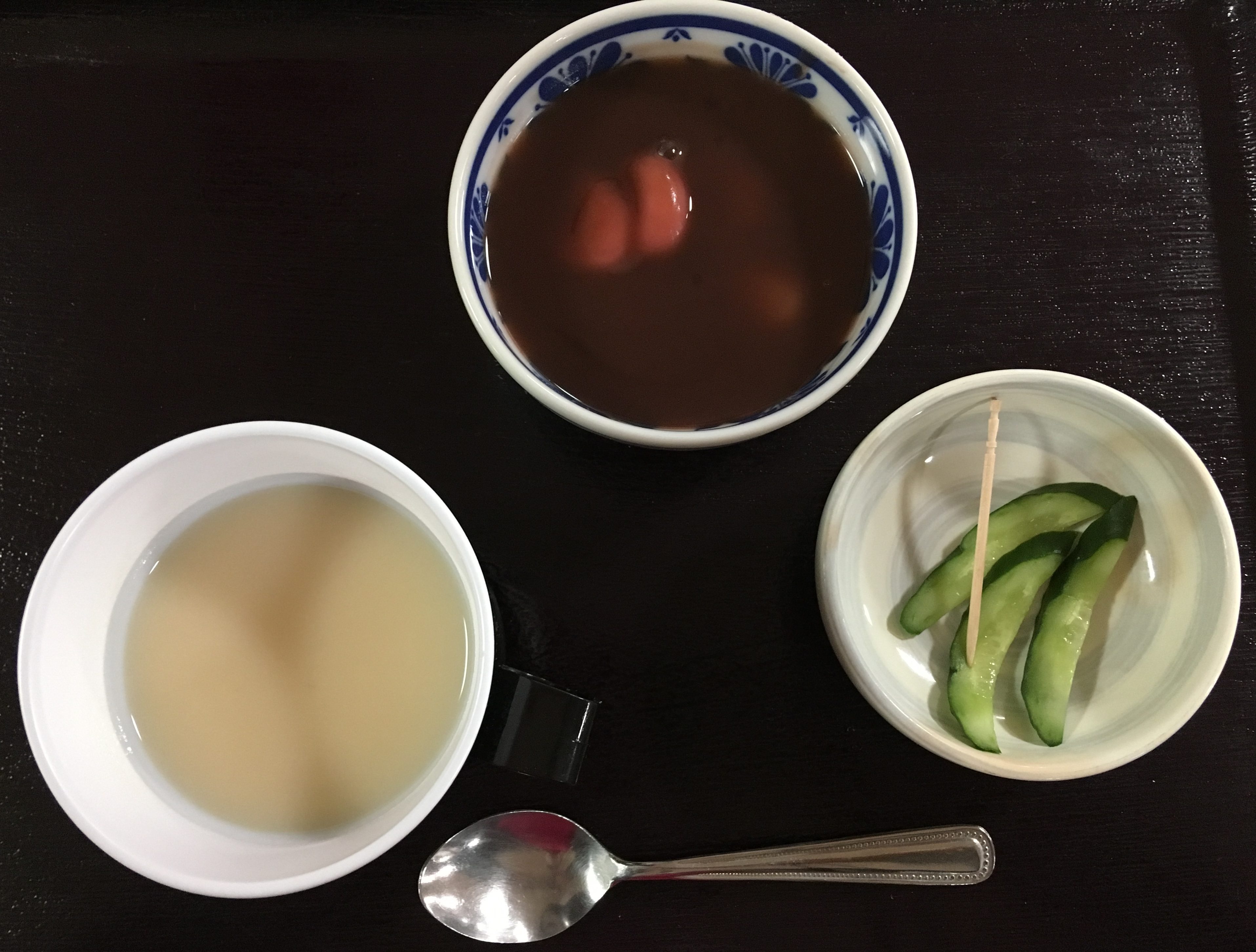 新年会の手作りおやつは、豪華に3品。紅白白玉 甘酒 お口直しのお新香です。