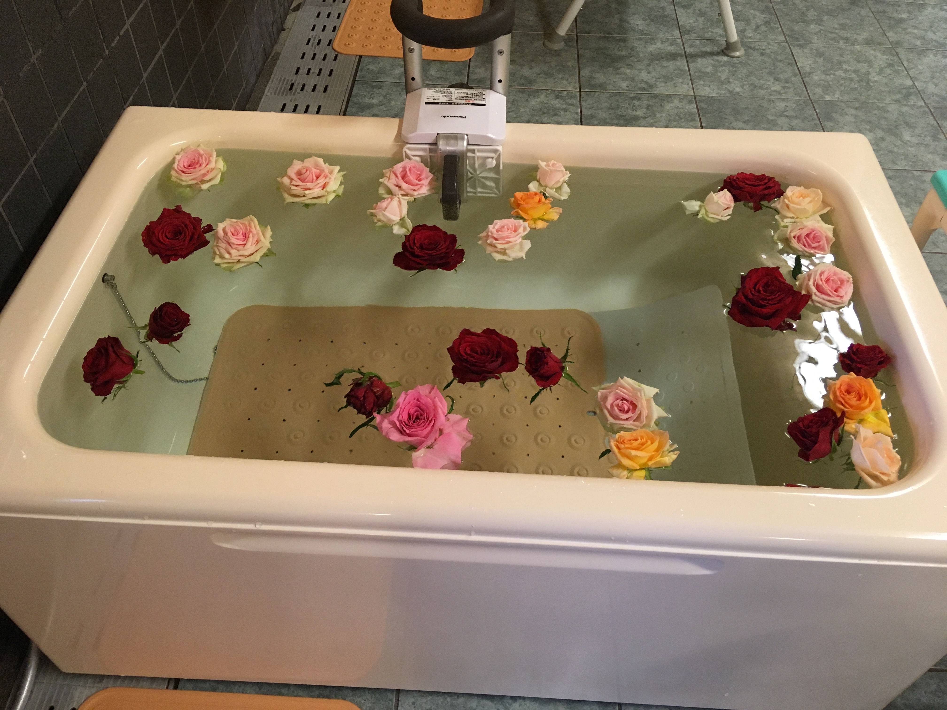 イベント昼食が母の日に近かったので、サプライズでお風呂もバラ風呂に!!