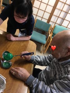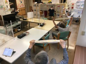 下の写真ですが、皆さんご自分のペースで身体を動かされています。タオルを使用して手を上げたり、タオルを丸めて上に投げて掴むなど皆さん笑顔で行われていました🙂