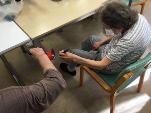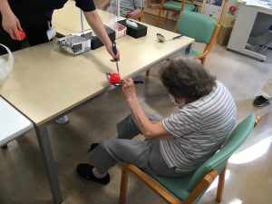 お玉ボールすくい大会、お隣の方に繋ぎ何回出来たか行われました!丁寧に繋がれて14回、落ちた時には大盛り上がりでした