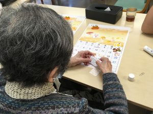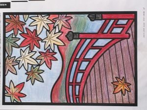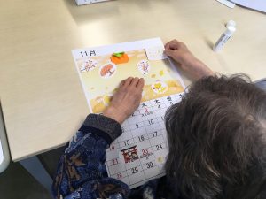 としま2 2021.10.29 2ディ〜11月カレンダー作成 紅葉の塗り絵🍁何色も使用してきれいに塗られたお客様の作品です。 11月のカレンダーは栗やどんぐり、七五三の紅葉などご自分のセンスで貼って頂きました。