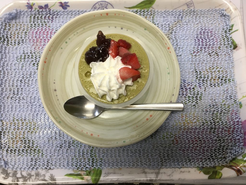 ↑今回の特別おやつの抹茶プリンでした。苺と生クリームとあんこのトッピング付きです!