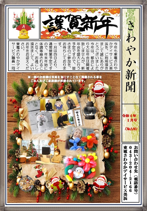 美浜 2021.12.24 さわやか新聞1月号<デイ美浜> こんにちは。 東電さわやかデイサービス美浜です。 さわやか新聞1月号を掲載致します。 令和4年も、さわやか新聞を 宜しくお願い致します♪ ~スタッフ募集中~ 私たちと一緒にお客さまを笑顔にするお手伝いをして みませんか? TEL 03-5621-7337 (本社:採用担当) ホームページはここから 東電さわやかデイサービス美浜では、随時見学を 受け付けています。ご興味がある方は 是非043-204-2166までご連絡下さい。 皆さまからのご連絡お待ちしております!