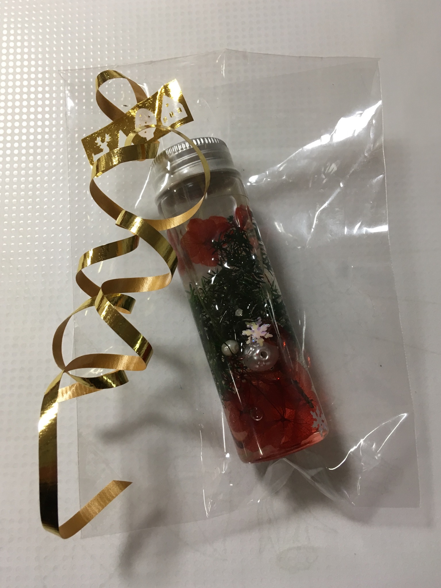 次はクリスマス会のメインイベント。今年はハーバリウム作りに挑戦です。テーブルには小瓶と綺麗なドライフラワーが配られ、みなさん作品作りに夢中です。赤や緑の飾りがクリスマス気分を盛り上げますね。