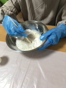 粉が馴染んだら手でこねる。「まとまらない、硬いね」