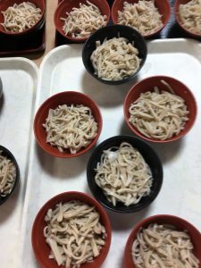 そば粉に水を入れ割り箸で混ぜます。