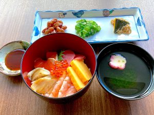 海鮮丼の中身はマグロ、サーモン、煮穴子、玉子、海老、イクラです。