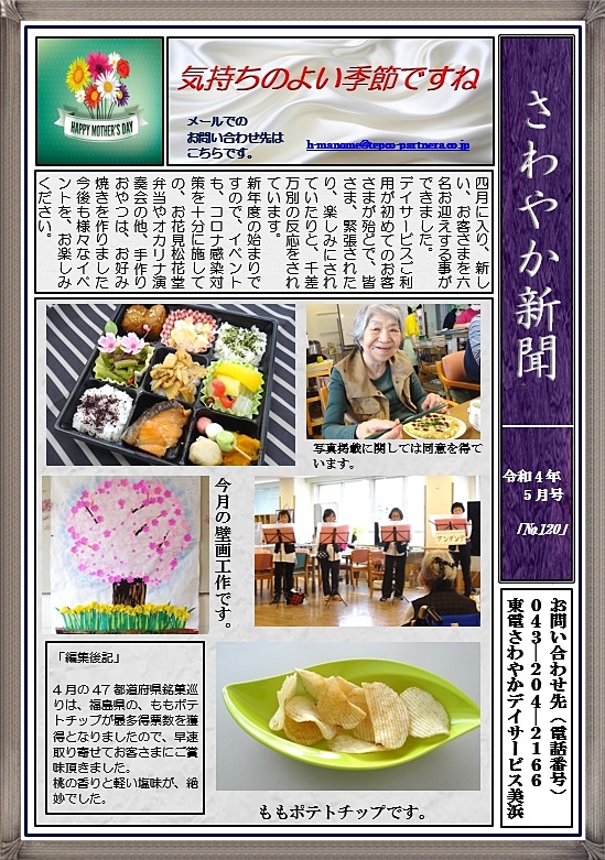 美浜 2022.04.25 さわやか新聞5月号<デイ美浜> こんにちは。 東電さわやかデイサービス美浜です。 さわやか新聞5月号をご覧ください。 来月も、色々なイベントで お客さまを、お迎え致します。 ~スタッフ募集中~ 私たちと一緒にお客さまを笑顔にするお手伝いをして みませんか? TEL 03-5621-7337 (本社:採用担当) ホームページはここから 当デイサービスでは、随時見学を受け付けています。 ご興味がある方は、是非043-204-2166まで ご連絡ください。 皆さまからのご連絡お待ちしております!