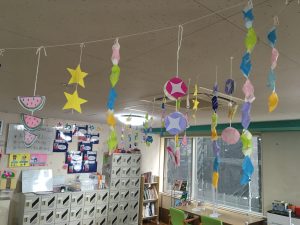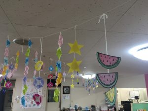 皆さまに作っていただいた天井飾りで、七夕の雰囲気が出ております。