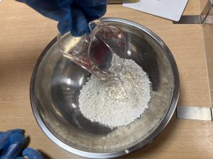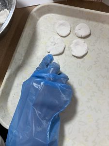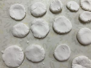 よーくこねたら、クルクル丸めて、真ん中をつぶします。