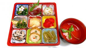 ご飯は筍ご飯など3種類、鯛とマグロのお刺身、若鶏の二色巻き、サワラの西京焼き、