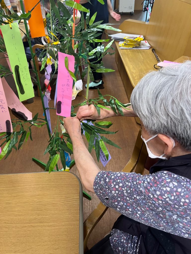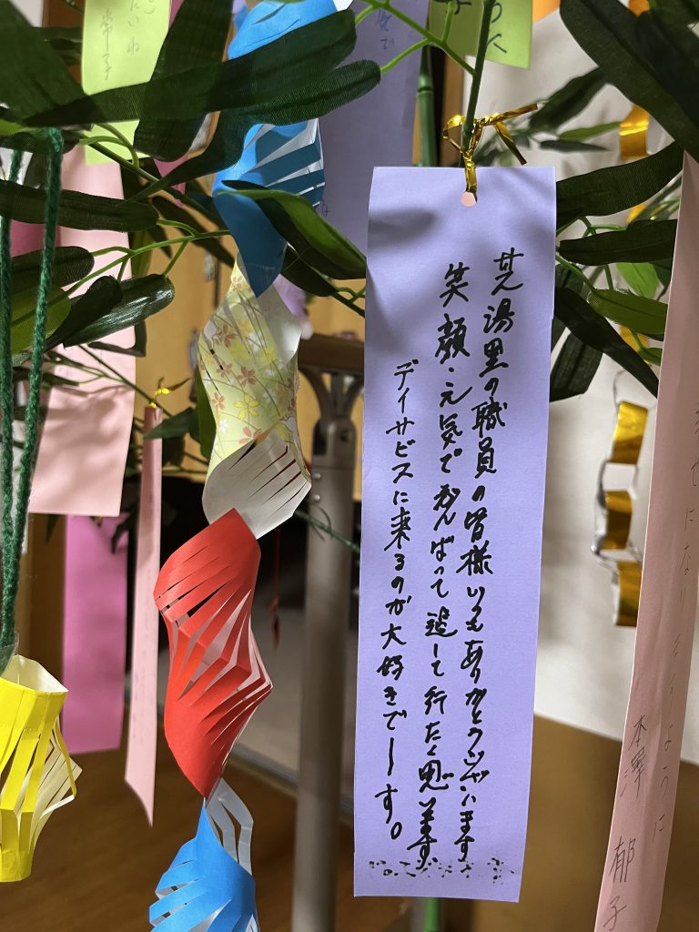 お客様と職員が一緒に作成した七夕飾りです。風があたるとゆらゆらと揺れてとても涼しげです。
