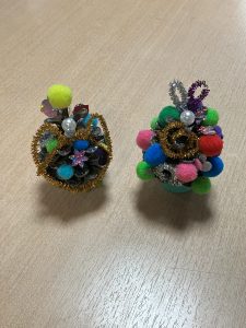 松ぼっくりに色を付けて、色やバランスを考えながらボンボンを飾ります。
