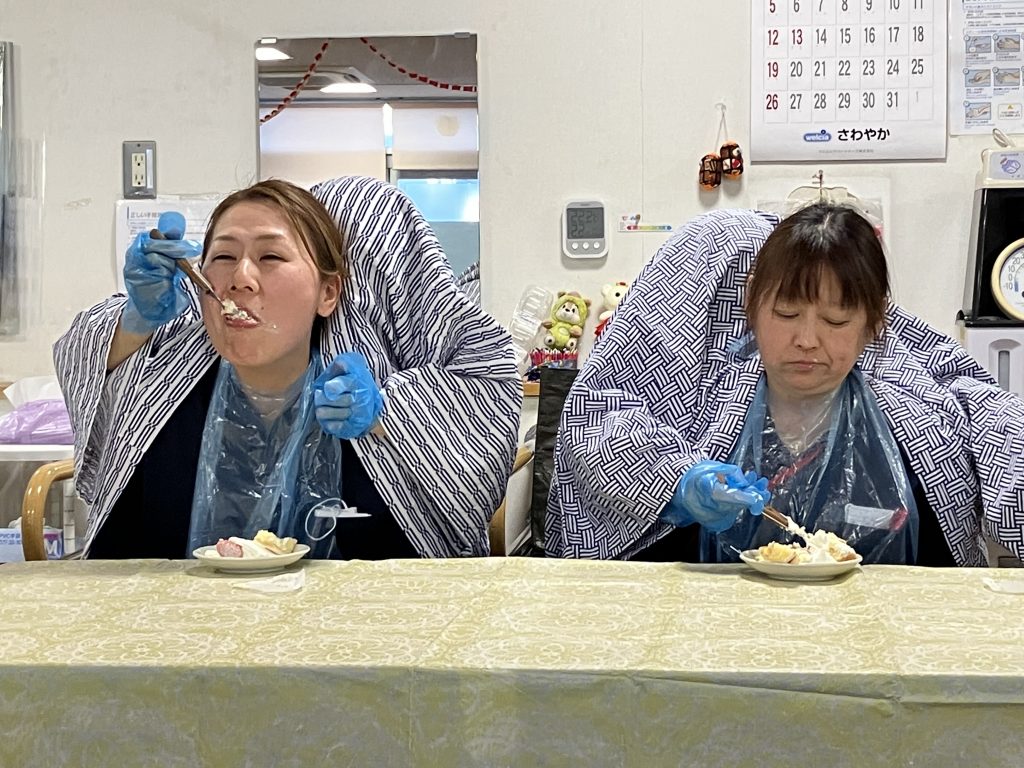 最後はスタッフから皆さんへ笑いのプレゼントで「二人羽織」を披露しました。