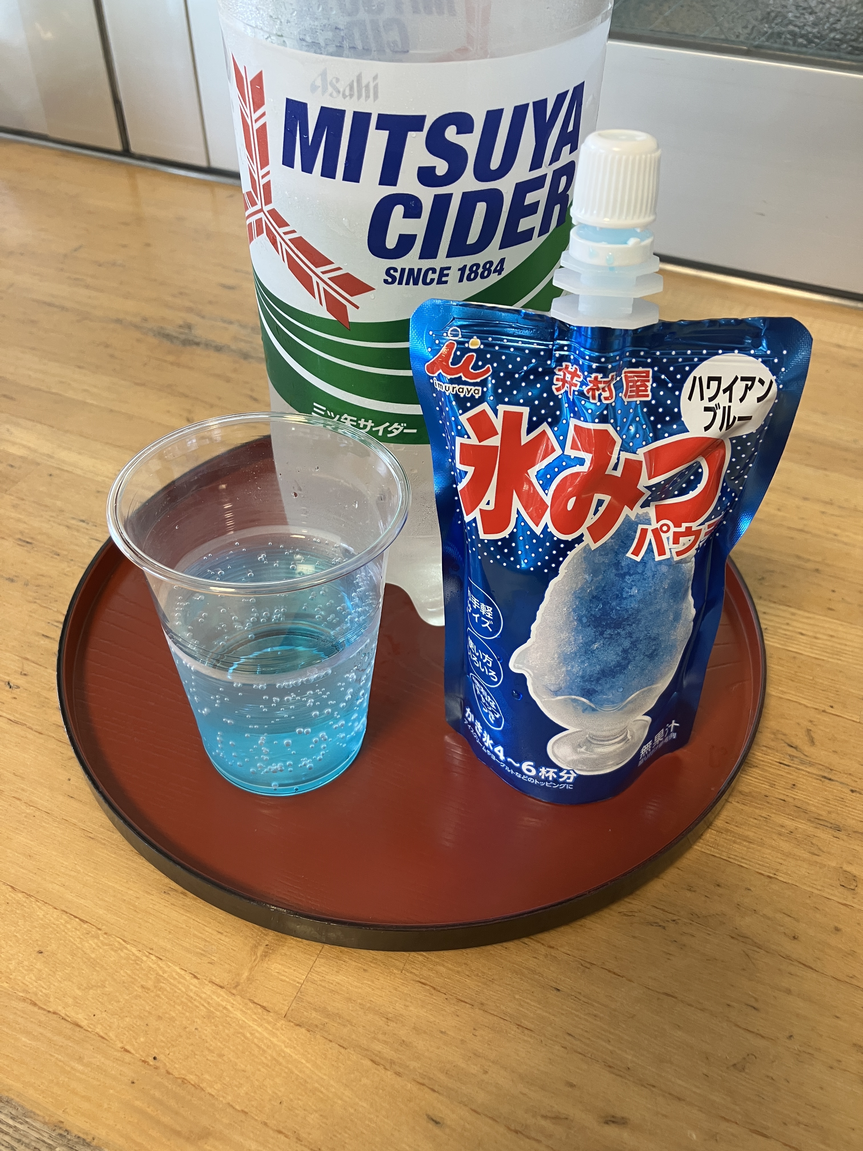 お風呂上りに、ブルーハワイサイダーを飲んで頂きました。