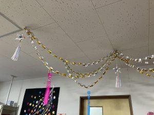 天井に煌めく星をイメージした輪っか飾りと吹き流しの飾りをつけました