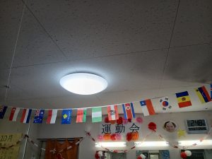 まずフロア内は紅白と国旗で運動会らしく飾りつけました。