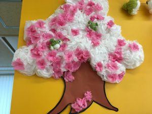 桜は、お花紙で小さなお花を作り、貼りました。
