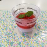 デザートは「スイカゼリー」です。鮮やかな2層のデザートです。