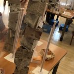 お客さまに新聞を折っていただき、三角形に組み立てていただきます。お一人さま10個くらい作っていただいた所で