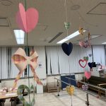 フロア飾りです。立体的なハートやリボンを飾り付け。
