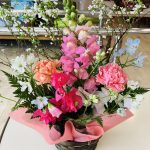 赤・ピンク・オレンジ・水色・白のお花を使った春らしい作品に仕上がりました。