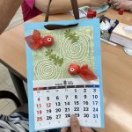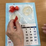 今月のカレンダーは立体的金魚を飾り水泡や水草を飾りました。