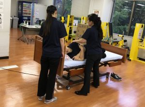 杖歩行、車いすなどの基本介助の他、ビニールシートを使っての水平移動も行いました![]()