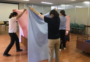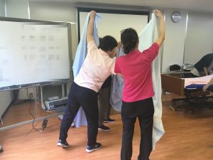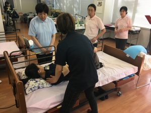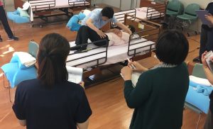 ベッド上の介助では、講師から細かな説明があってからの練習で、